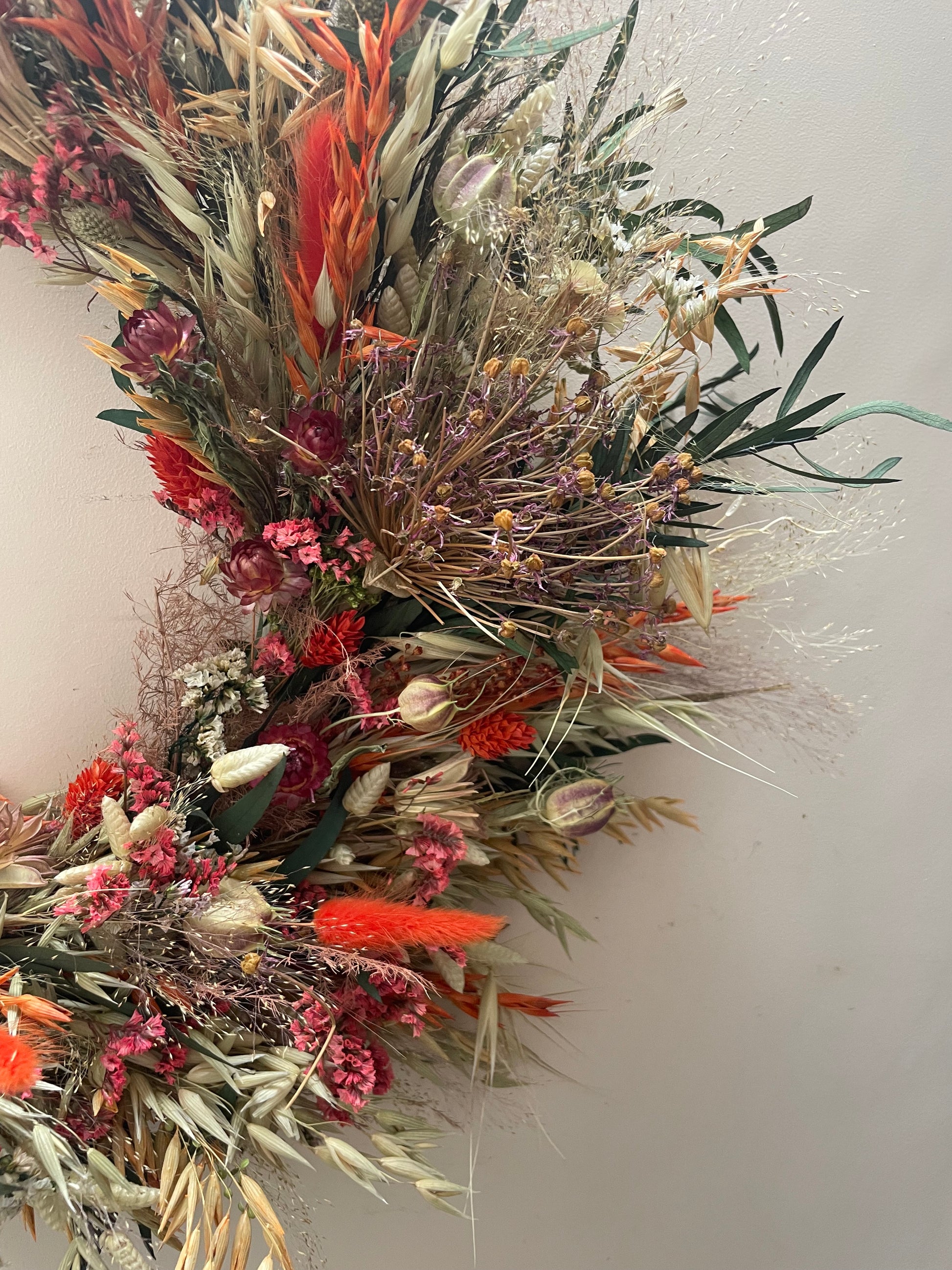 This Dried Flower wreath has been created on a 25cm vine wreath base. It’s packed full of textures and subtle flash of oranges and Autumnal shades. It includes a mix of high quality dried stems:
