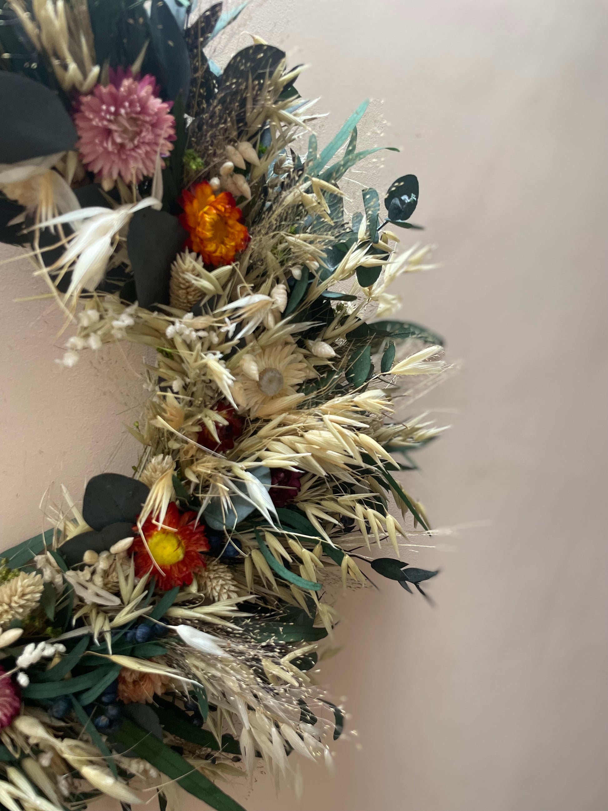 This Dried Flower wreath has been created on a 25cm vine wreath base. It’s packed full of texture green foliage and grasses with pops of multi coloured helichrysum.